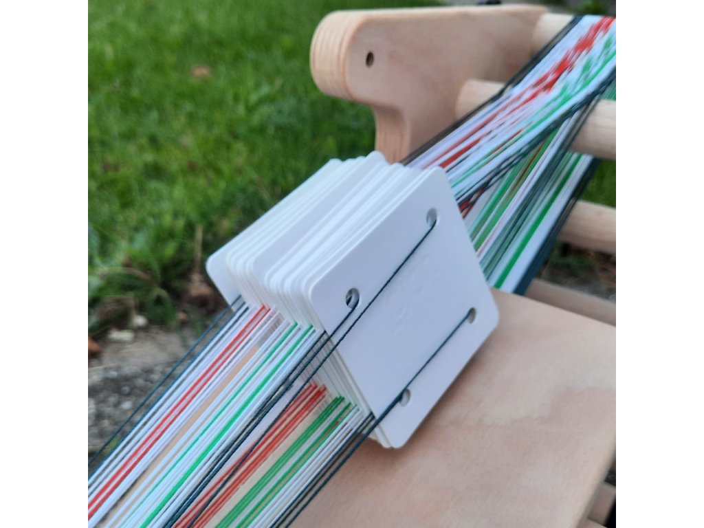 Sada deseti kompaktních karet pro karetkové tkaní. Karty jsou vyrobeny z pevného bílého hladkého kartonu o tloušťce 0,8 mm, což jim dává dlouhou životnost.